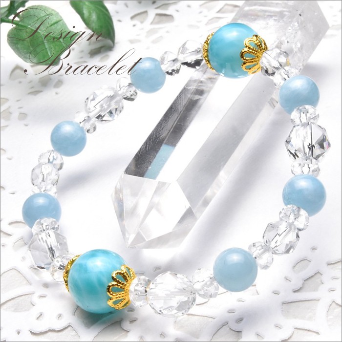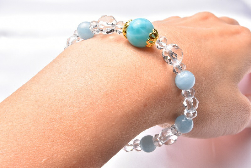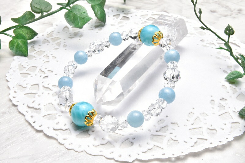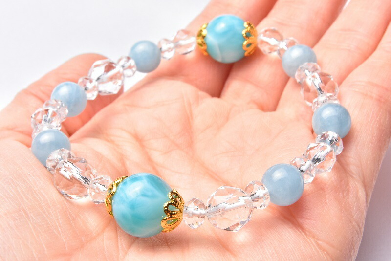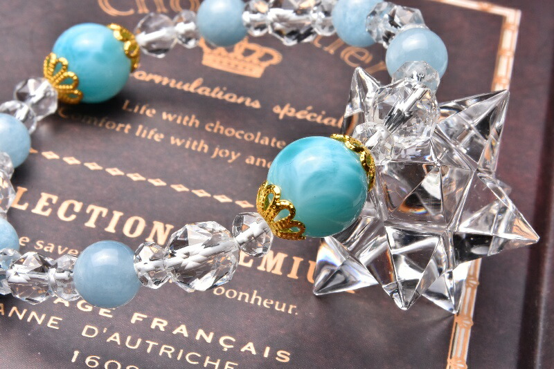 特徴・意味高品質の大粒のラリマーを2粒使用。同じく爽やかな色合いのアクアマリンを挟み、大小のカット水晶で輝きを添えました。上品ながらも高級感あふれる出来上がりとなっております。ラリマーとアクアマリンの組み合わせは、リラックスやヒーリングに適した組み合わせで、恋愛の運気も兼ね備えております。 恋愛運の運気