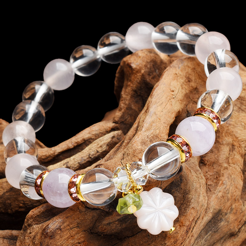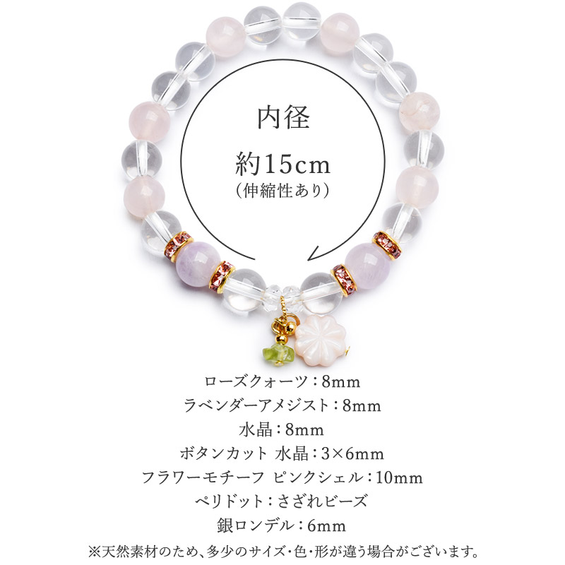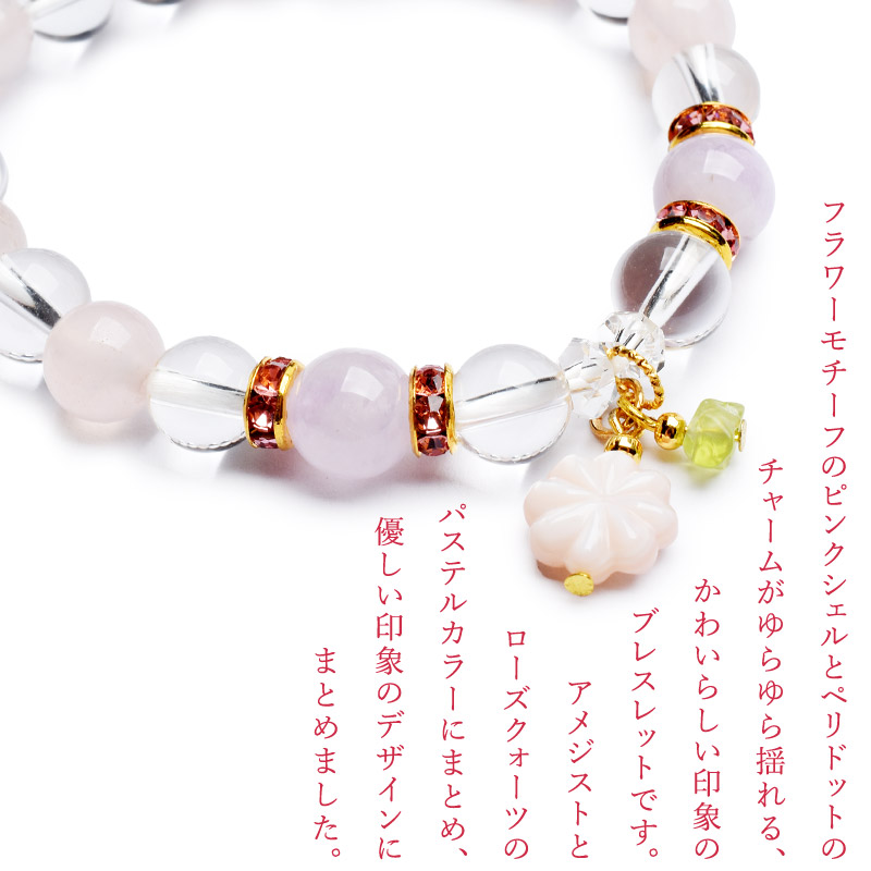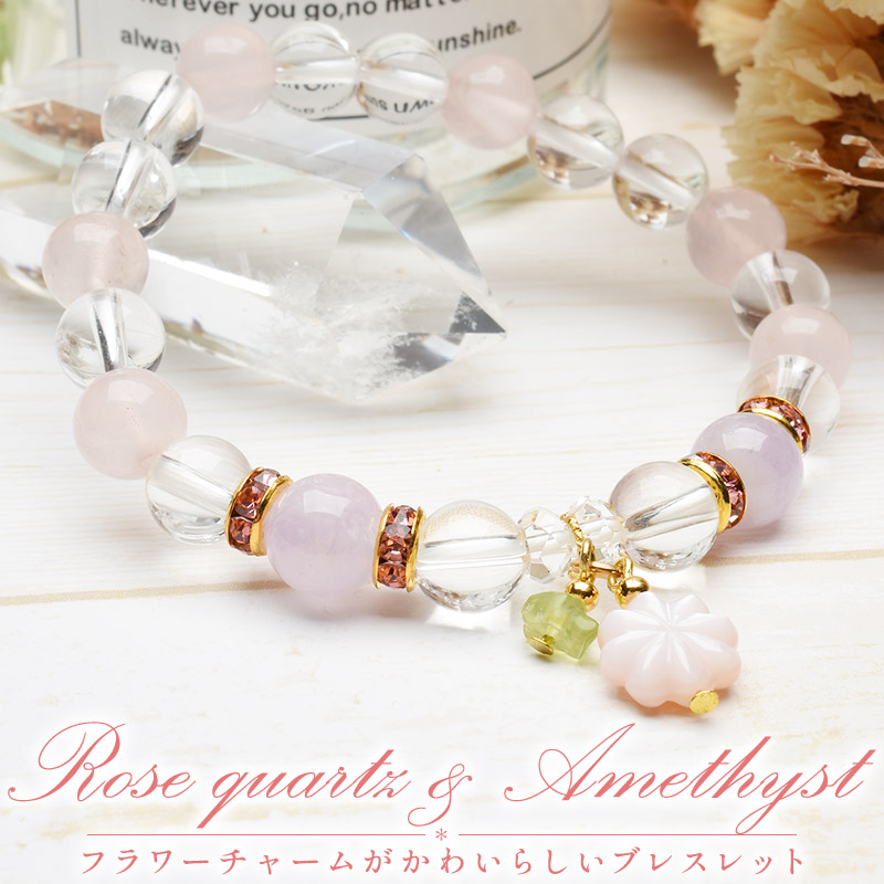春の守 愛の調和 フラワーモチーフチャーム付 ローズクォーツx淡アメジスト 当店オリジナルブレス 天然石パワーストーン_A728