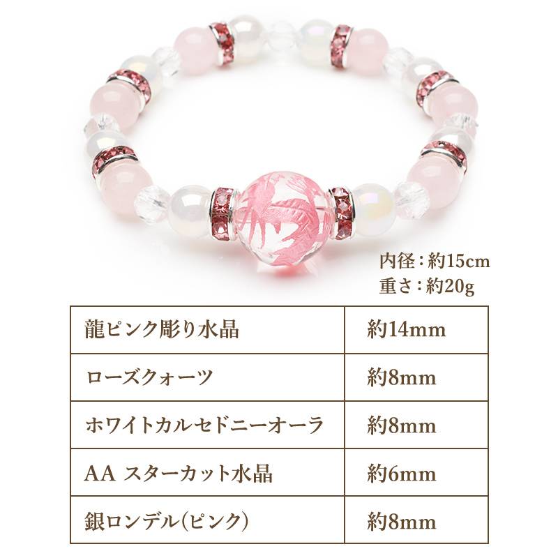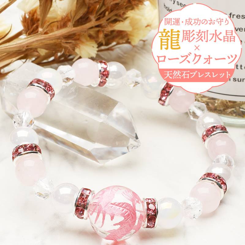 特徴・意味本水晶に華やかなピンク色の龍神が彫刻されており、人気のマダガスカル産ローズクォーツと組み合わせることで、より華やかで女性でも身につけやすい、可愛らしい印象のブレスレットに仕上げました。