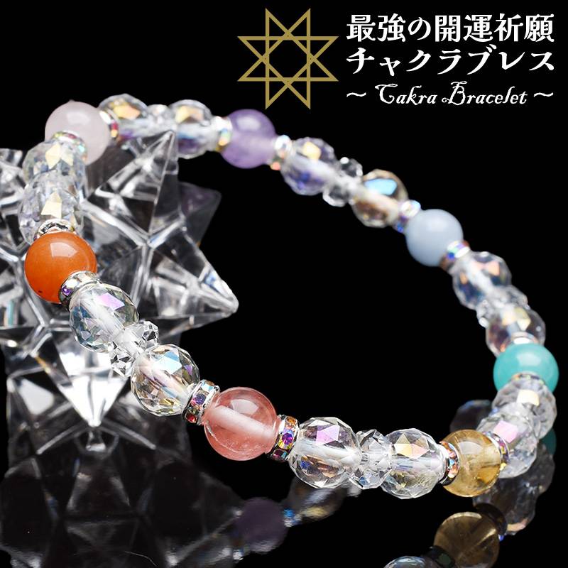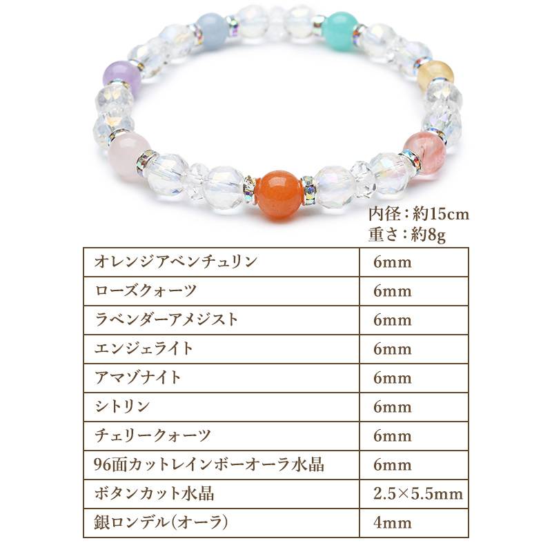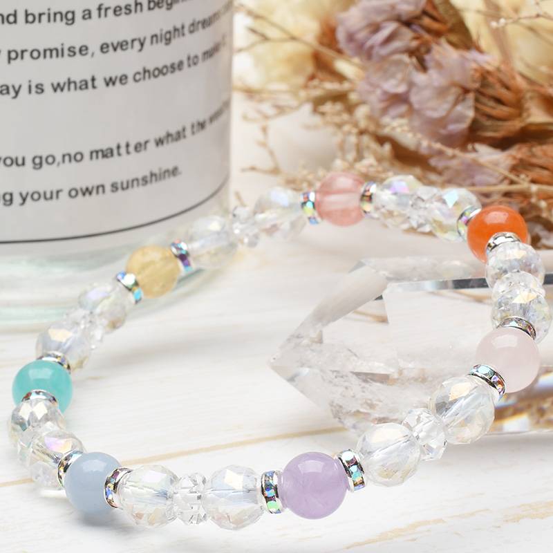 特徴・意味オーラ加工とカットの輝きが美しい水晶と7色のパステルカラーの天然石を組み合わせ均等に配置した小ぶりで可愛らしいチャクラブレスレットです。