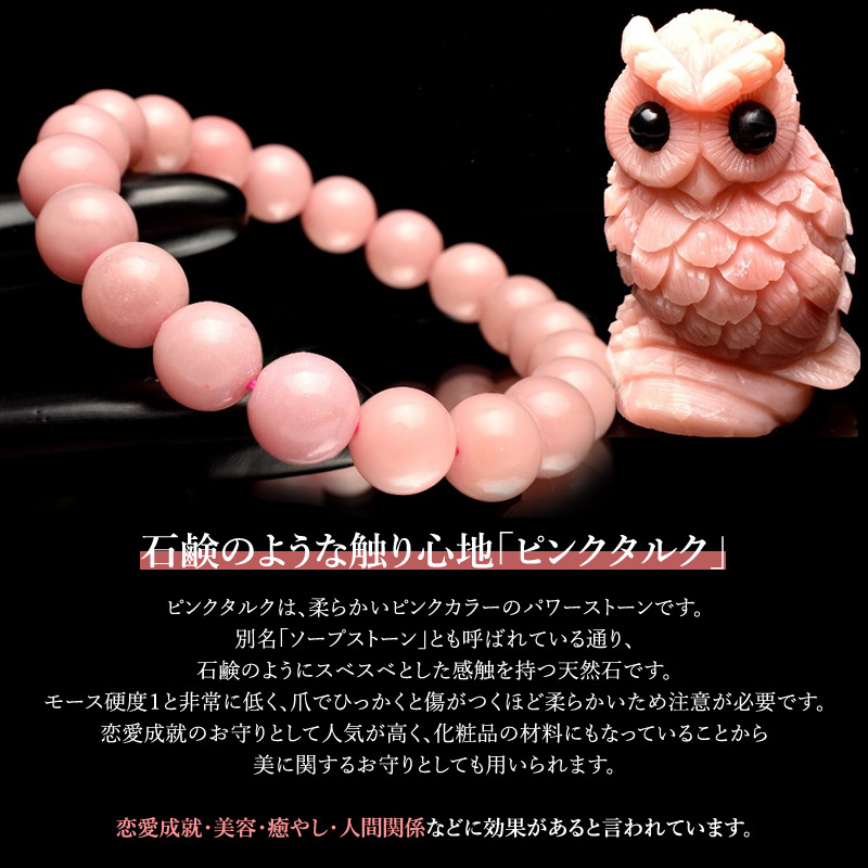 タルクという鉱物自体は、本来白色や淡緑色なのですが、ビーズ加工されているものはピンク色をしています。