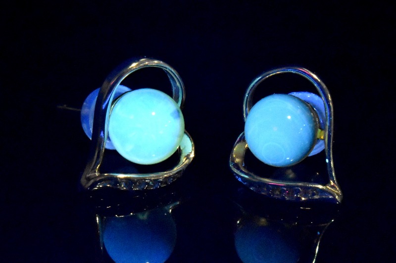 通常のブルーアンバーは金色や赤茶色などのような色合いですが、わずかな太陽の光にも反応し角度によって鮮やかな青色や緑色に輝きます。