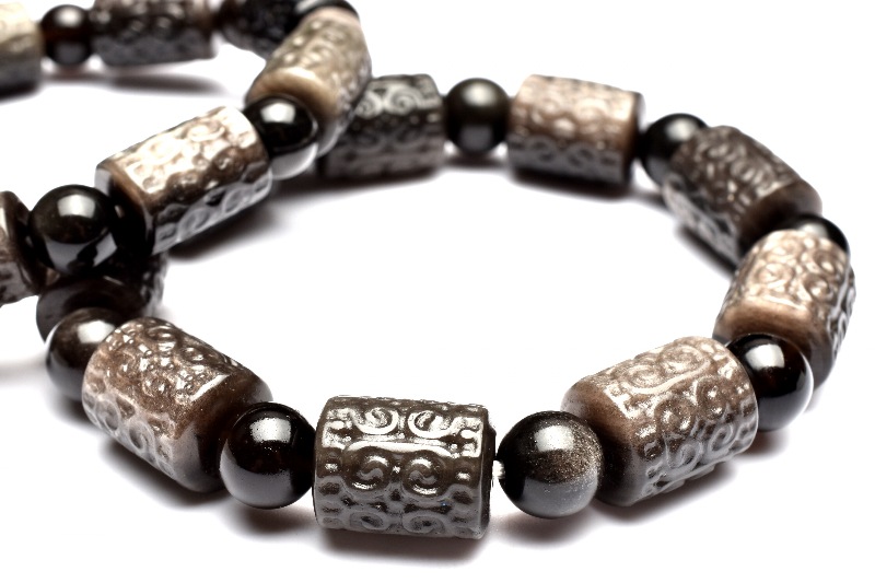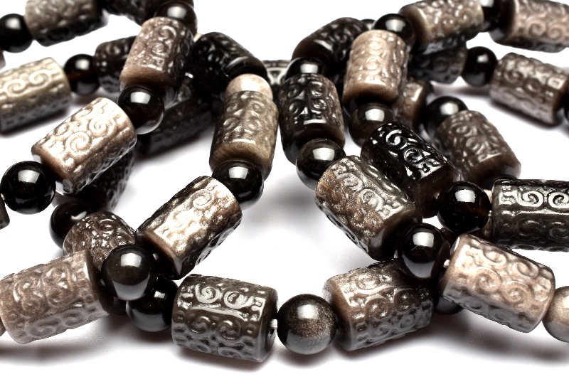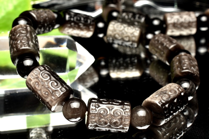 繊細彫刻 シルバーオブシディアン 13.5-14x10.5-11(丸玉8.5)mm マニ車 チューブ ブレスレット 1個売り _BG5415-2