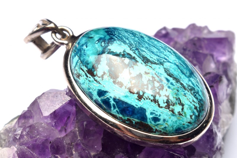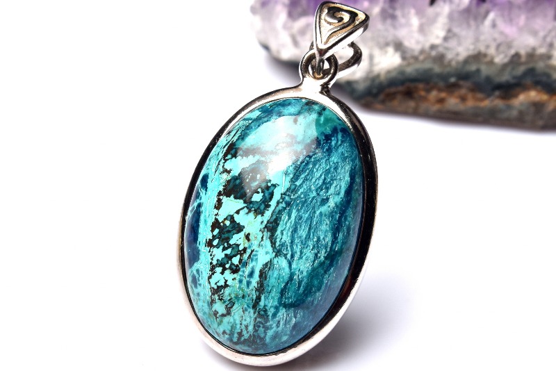 ブルーが本体の多くを占め、グリーンやブラウンなどのカラーが混ざり合って、出来ているため、丸く加工されたクリソコラは、宇宙から見た地球のような外観となっています。