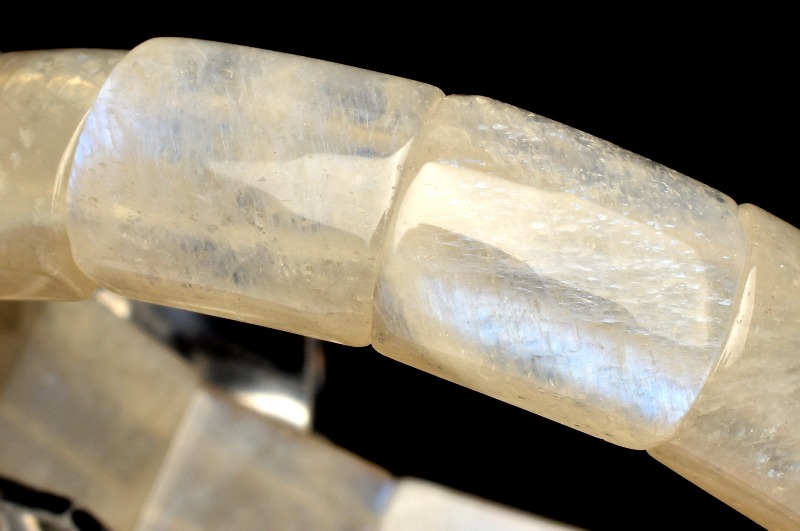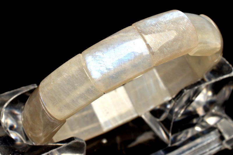 ムーンストーンは長石(フェルドスパー)という鉱物グループの一種。長石グループの石には、ラブラドライト、サンストーン、アマゾナイトなどがあり、同じ仲間とは思えないほど多種多様です。ムーンストーンはオーソクレース(正長石)を主とし、アルバイト(曹長石)を含むものをいい、この二種類の長石の層が重なり合って、光の内部反射と干渉が起こり、「シラー(シーン)」と呼ばれる幻想的な光の効果を見ることができます。この光こそがムーンストーンの最も特徴的な魅力でもあり、名前の元となるイメージをかきたてたのだと思います。一般的に知られるムーンストーンは乳白色、または半透明の物が多いようですが、他にもオレンジ、ピンク、イエロー、グリーン、灰色がかったグリーン、灰色、茶色、褐色など様々な色があります。
