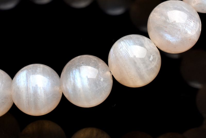 ムーンストーンは長石(フェルドスパー)という鉱物グループの一種。長石グループの石には、ラブラドライト、サンストーン、アマゾナイトなどがあり、同じ仲間とは思えないほど多種多様です。ムーンストーンはオーソクレース(正長石)を主とし、アルバイト(曹長石)を含むものをいい、この二種類の長石の層が重なり合って、光の内部反射と干渉が起こり、「シラー(シーン)」と呼ばれる幻想的な光の効果を見ることができます。この光こそがムーンストーンの最も特徴的な魅力でもあり、名前の元となるイメージをかきたてたのだと思います。一般的に知られるムーンストーンは乳白色、または半透明の物が多いようですが、他にもオレンジ、ピンク、イエロー、グリーン、灰色がかったグリーン、灰色、茶色、褐色など様々な色があります。