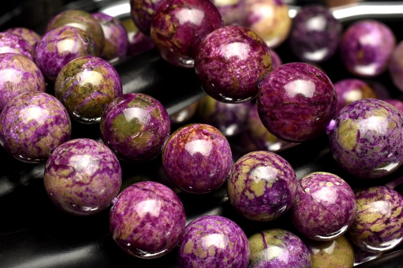 スティヒタイト自体は、流通量が少ないものの、世界中のあらゆる地域で産出されている鉱物です。産出される際、緑色の鉱物であるサーペンティン(蛇紋石)と共生した塊状で見つかります。紫色のスティヒタイト、緑色のサーペンティンが混ざり合った姿は、なんとも不可思議な魅力を持ち、天然石愛好家からは、「スティヒタイトインサーペンティン(別名アトランティサイト)」の名称で親しまれています。