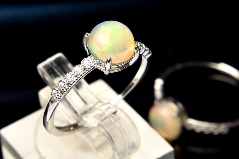 オパールの語源は、古代サンスクリット語の「宝石」を意味する「ウパラ」であるとされています。オパールは水中で微小な珪酸球が沈殿し、岩石の隙間などに密に蓄積して形成される石です。水晶等と同じく、珪素をメインにする鉱物ですが、その成り立ちから、水分が多く、硬度も非常に柔らかい石です。