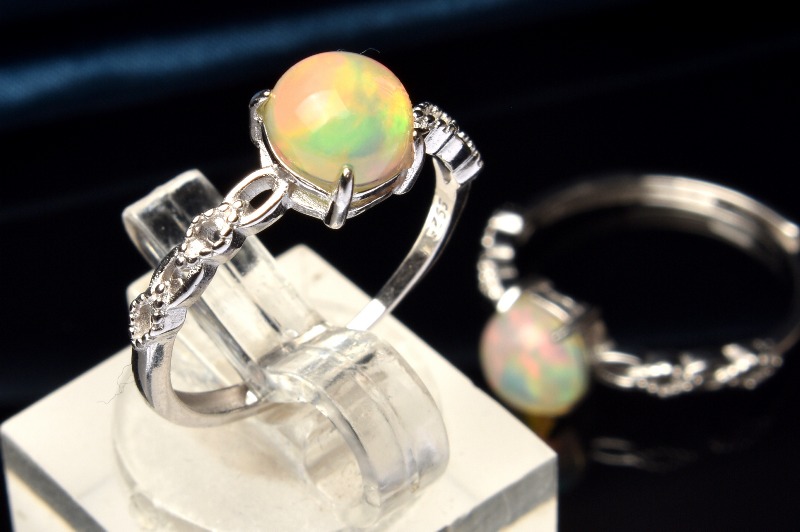 オパールの語源は、古代サンスクリット語の「宝石」を意味する「ウパラ」であるとされています。オパールは水中で微小な珪酸球が沈殿し、岩石の隙間などに密に蓄積して形成される石です。水晶等と同じく、珪素をメインにする鉱物ですが、その成り立ちから、水分が多く、硬度も非常に柔らかい石です。