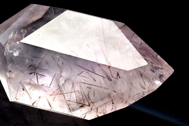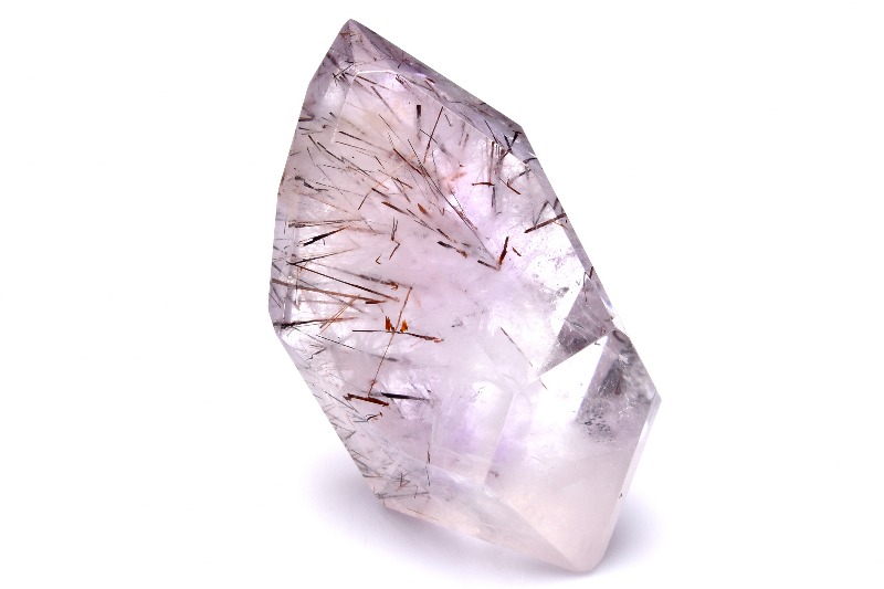 水晶の色変種の中では最高位と評価されているアメジスト(紫水晶)の中にゲーサイト(針鉄鉱)が内包された、美しい天然石です。