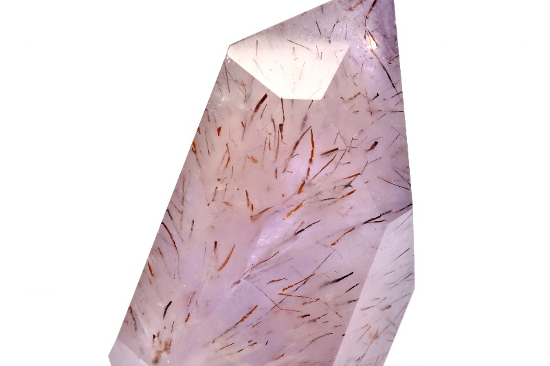 水晶の色変種の中では最高位と評価されているアメジスト(紫水晶)の中にゲーサイト(針鉄鉱)が内包された、美しい天然石です。