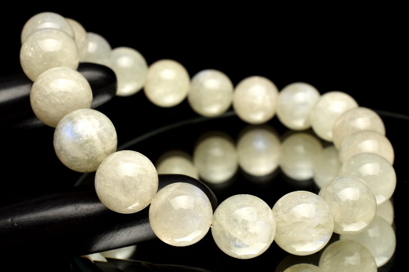 ムーンストーンは長石(フェルドスパー)という鉱物グループの一種。長石グループの石には、ラブラドライト、サンストーン、アマゾナイトなどがあり、同じ仲間とは思えないほど多種多様です。ムーンストーンはオーソクレース(正長石)を主とし、アルバイト(曹長石)を含むものをいい、この二種類の長石の層が重なり合って、光の内部反射と干渉が起こり、「シラー(シーン)」と呼ばれる幻想的な光の効果を見ることができます。この光こそがムーンストーンの最も特徴的な魅力でもあり、名前の元となるイメージをかきたてたのだと思います。一般的に知られるムーンストーンは乳白色、または半透明の物が多いようですが、他にもオレンジ、ピンク、イエロー、グリーン、灰色がかったグリーン、灰色、茶色、褐色など様々な色があります。