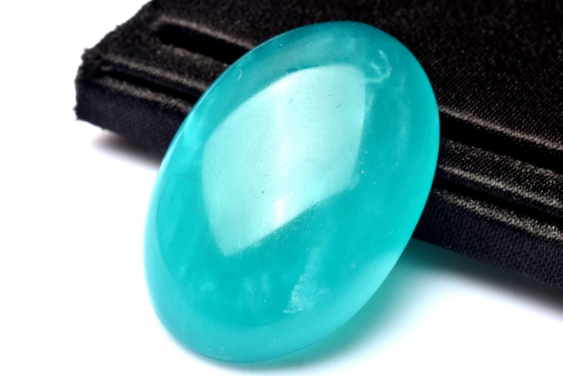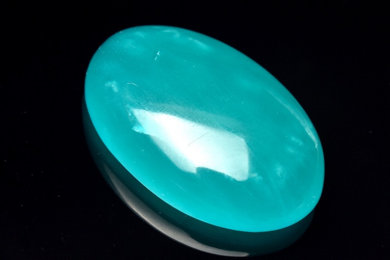 最近流通し始めたウイグル産アマゾナイトは鮮やかなブルーで透明感があります。石の強度を高くするために樹脂を浸透させる「タビライズド加工(含浸処理)」を施しており、この加工によって透明度が増しています。ロシアとペルー産はうまく浸透しないため、ウイグル産だけがこのような質感になるらしいです。