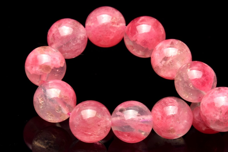 ロードナイトの和名は薔薇輝石。マンガンが主成分で、一般的に見られるものはピンク色ですが、鉄が多く含まれるとより赤くなります。黒い斑や筋状の部分は酸化マンガンです。