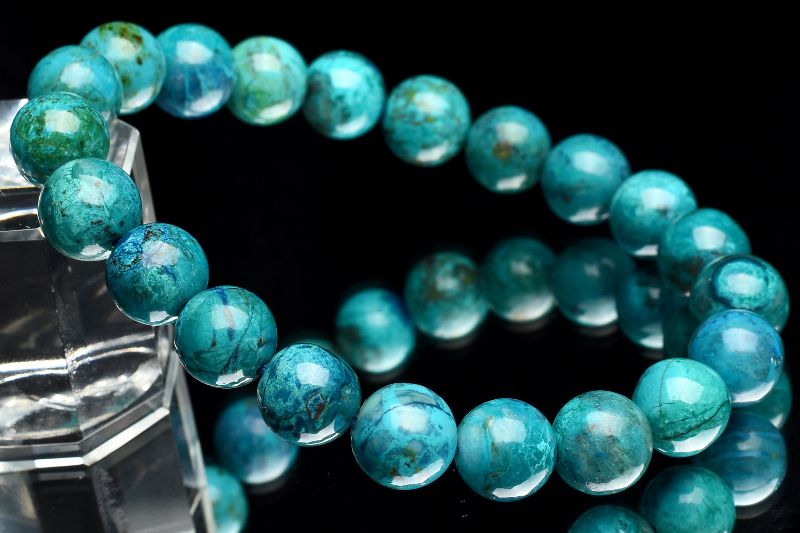 ブルーが本体の多くを占め、グリーンやブラウンなどのカラーが混ざり合って、出来ているため、丸く加工されたクリソコラは、宇宙から見た地球のような外観となっています。