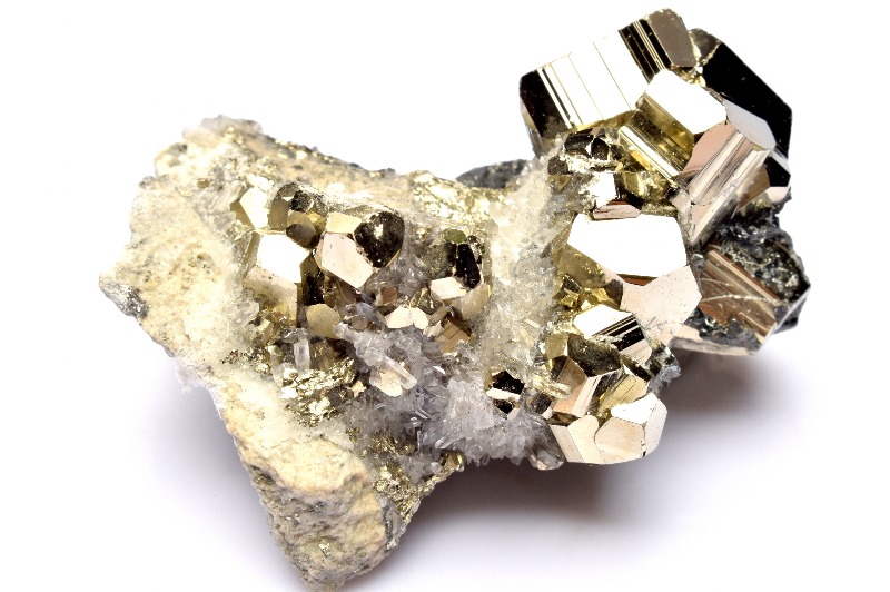 和名を「黄鉄鉱(おうてっこう)」と言い、鉄と硫黄からできている硫化鉱物です。