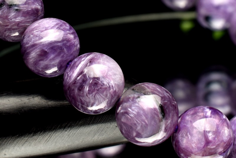 チャロアイトという名前の由来には、シベリアのチャロ川流域で発見された事とする説と、ロシア語の(Charo魅惑)から名づけられたという説がありますが、後者の方が有力であるとされています。その名の通り、この石の個性的な模様は、見る人を魅了してやみません。まさに、「魅惑の宝石」にぴったりな石です。