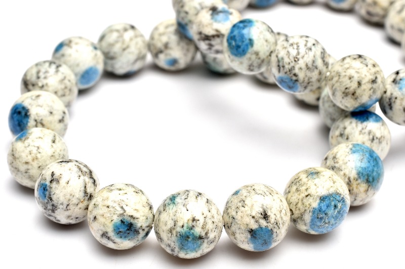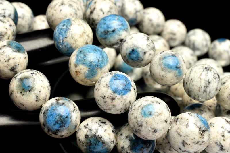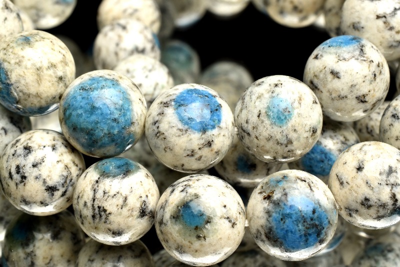 K2ブルーと呼ばれるこの石は、白地をベースに黒色の斑模様が浮かび、さらにそこに入り込んだ鮮やかな青のスポットが魅力的な色彩を付け加えた石です。