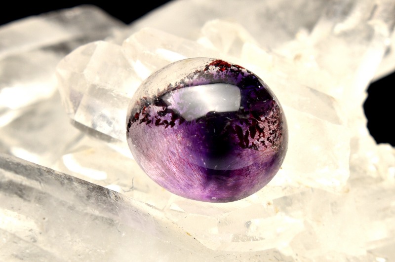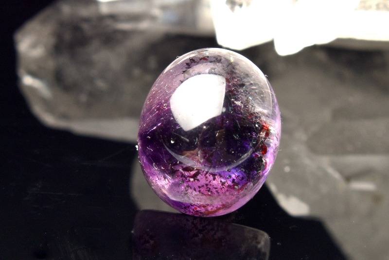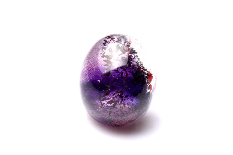 水晶の色変種の中では最高位と評価されているアメジスト(紫水晶)の中にゲーサイト(針鉄鉱)が内包された、美しい天然石です。