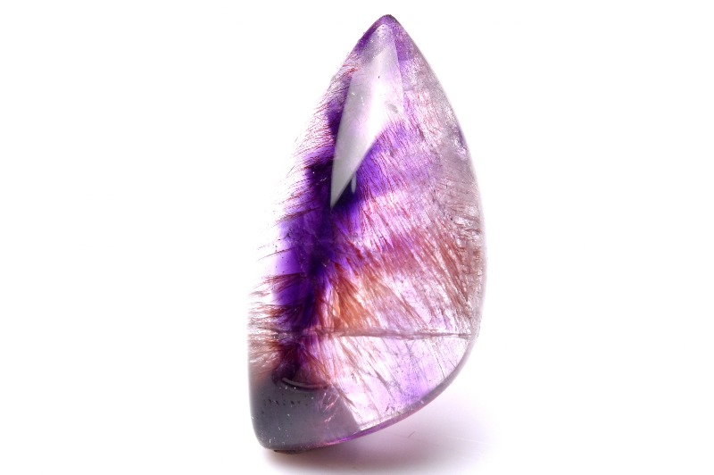 水晶の色変種の中では最高位と評価されているアメジスト(紫水晶)の中にゲーサイト(針鉄鉱)が内包された、美しい天然石です。