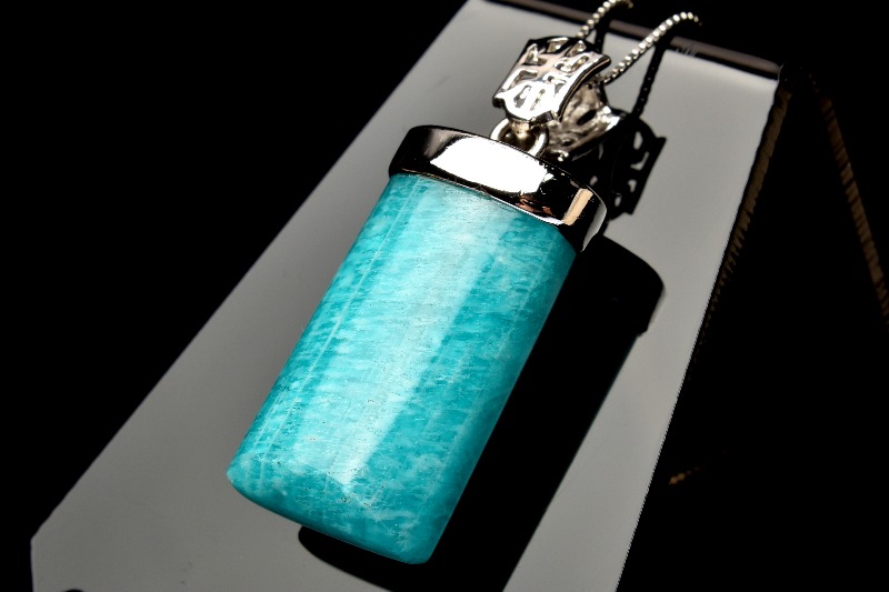アマゾナイトのブルーとシルバー枠の相性が良く上品な印象のペンダントトップです。