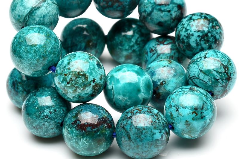 マラカイトの和名を「孔雀石」と言いますが、クリソコラの和名と似ている理由はマラカイトの組成に、珪素を加えたような組成となっているからです。