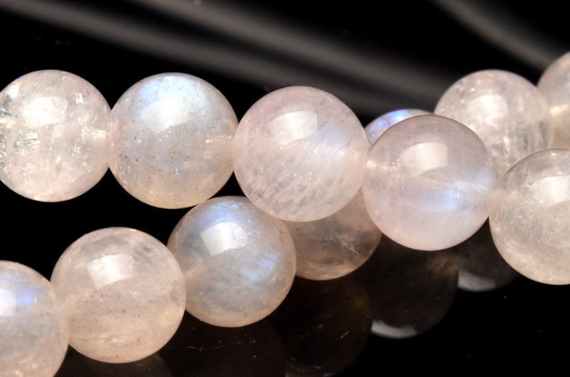 ムーンストーンは長石(フェルドスパー)という鉱物グループの一種。長石グループの石には、ラブラドライト、サンストーン、アマゾナイトなどがあり、同じ仲間とは思えないほど多種多様です。ムーンストーンはオーソクレース(正長石)を主とし、アルバイト(曹長石)を含むものをいい、この二種類の長石の層が重なり合って、光の内部反射と干渉が起こり、「シラー(シーン)」と呼ばれる幻想的な光の効果を見ることができます。この光こそがムーンストーンの最も特徴的な魅力でもあり、名前の元となるイメージをかきたてたのだと思います。一般的に知られるムーンストーンは乳白色、または半透明の物が多いようですが、他にもオレンジ、ピンク、イエロー、グリーン、灰色がかったグリーン、灰色、茶色、褐色など様々な色があります。