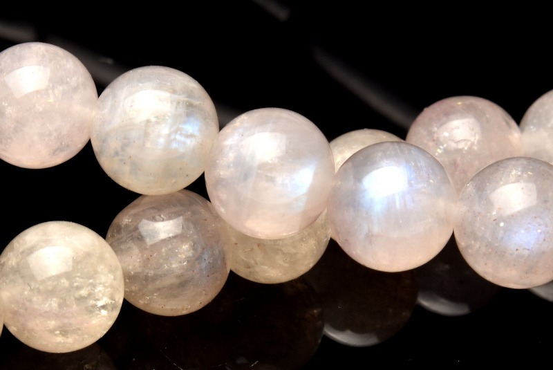 ムーンストーンは長石(フェルドスパー)という鉱物グループの一種。長石グループの石には、ラブラドライト、サンストーン、アマゾナイトなどがあり、同じ仲間とは思えないほど多種多様です。ムーンストーンはオーソクレース(正長石)を主とし、アルバイト(曹長石)を含むものをいい、この二種類の長石の層が重なり合って、光の内部反射と干渉が起こり、「シラー(シーン)」と呼ばれる幻想的な光の効果を見ることができます。この光こそがムーンストーンの最も特徴的な魅力でもあり、名前の元となるイメージをかきたてたのだと思います。一般的に知られるムーンストーンは乳白色、または半透明の物が多いようですが、他にもオレンジ、ピンク、イエロー、グリーン、灰色がかったグリーン、灰色、茶色、褐色など様々な色があります。