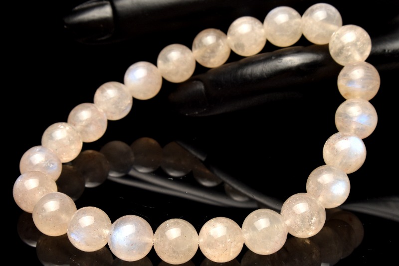 ムーンストーンは長石(フェルドスパー)という鉱物グループの一種。長石グループの石には、ラブラドライト、サンストーン、アマゾナイトなどがあり、同じ仲間とは思えないほど多種多様です。ムーンストーンはオーソクレース(正長石)を主とし、アルバイト(曹長石)を含むものをいい、この二種類の長石の層が重なり合って、光の内部反射と干渉が起こり、「シラー(シーン)」と呼ばれる幻想的な光の効果を見ることができます。この光こそがムーンストーンの最も特徴的な魅力でもあり、名前の元となるイメージをかきたてたのだと思います。一般的に知られるムーンストーンは乳白色、または半透明の物が多いようですが、他にもオレンジ、ピンク、イエロー、グリーン、灰色がかったグリーン、灰色、茶色、褐色など様々な色があります。