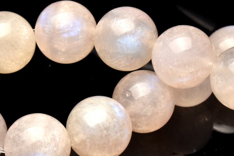 ムーンストーンは長石(フェルドスパー)という鉱物グループの一種。長石グループの石には、ラブラドライト、サンストーン、アマゾナイトなどがあり、同じ仲間とは思えないほど多種多様です。ムーンストーンはオーソクレース(正長石)を主とし、アルバイト(曹長石)を含むものをいい、この二種類の長石の層が重なり合って、光の内部反射と干渉が起こり、「シラー(シーン)」と呼ばれる幻想的な光の効果を見ることができます。この光こそがムーンストーンの最も特徴的な魅力でもあり、名前の元となるイメージをかきたてたのだと思います。一般的に知られるムーンストーンは乳白色、または半透明の物が多いようですが、他にもオレンジ、ピンク、イエロー、グリーン、灰色がかったグリーン、灰色、茶色、褐色など様々な色があります。