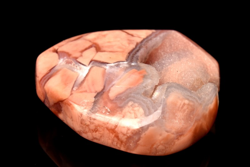 暖色系の瑪瑙(アゲート)の中にマーブル模様や層のような入り方をした内包をじっくり観察することができます。