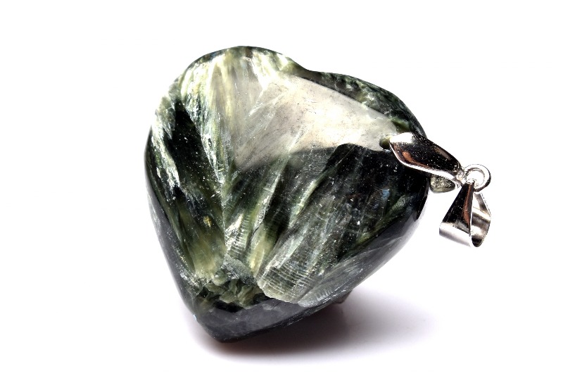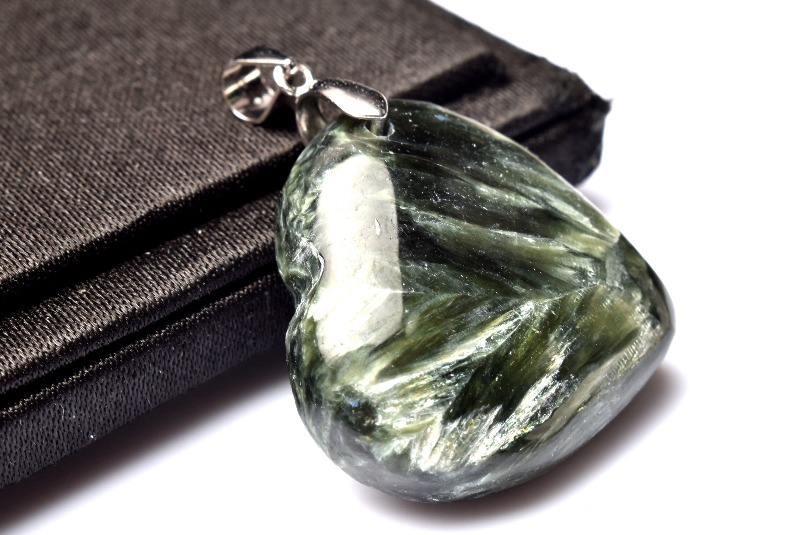 深緑色の地石の中に、白色〜銀色に輝く色彩の模様が「天使の羽」のように見えることがセラフィナイトの特徴です。