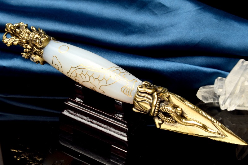 【1点物】チベット密教法具 白瑪瑙 ホワイトアゲート 168x25mm 五爪龍神 金剛杵 木製台座付き 天珠 _CG6206【宅急便のみ】