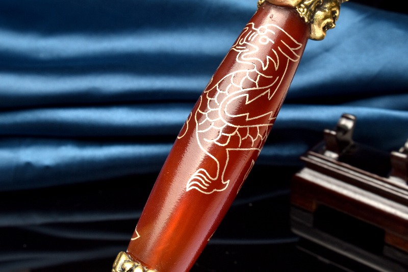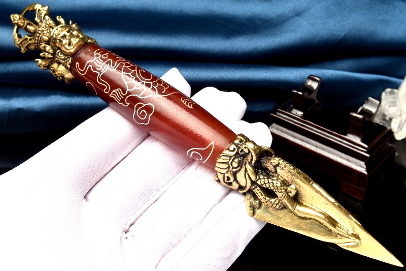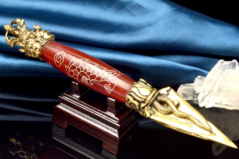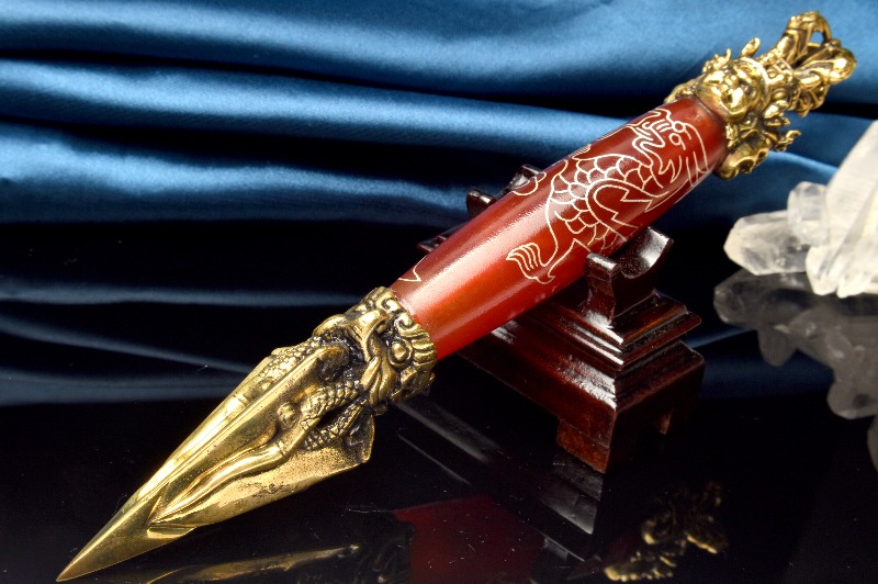 【1点物】チベット密教法具 赤瑪瑙 カーネリアン 168x24mm 五爪龍神 金剛杵 木製台座付き 天珠 _CG6208【宅急便のみ】