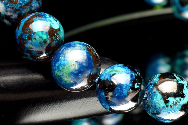 ブルーが本体の多くを占め、グリーンやブラウンなどのカラーが混ざり合って、出来ているため、丸く加工されたクリソコラは、宇宙から見た地球のような外観となっています。