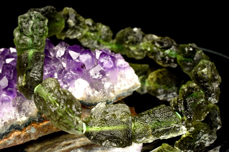 テクタイトは、遥か昔、地球に隕石が衝突した際に、その衝撃で地表の岩石が融解・飛散し、それらが冷やされてガラス質状に固まったものであるとされています。テクタイトは黒色ですが、モルダバイトは緑色、または褐色がかった透明で、ガラス光沢を放っています。