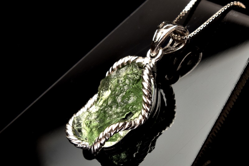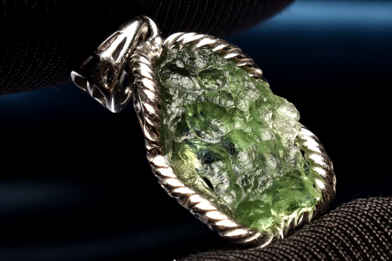 テクタイトは、遥か昔、地球に隕石が衝突した際に、その衝撃で地表の岩石が融解・飛散し、それらが冷やされてガラス質状に固まったものであるとされています。テクタイトは黒色ですが、モルダバイトは緑色、または褐色がかった透明で、ガラス光沢を放っています。