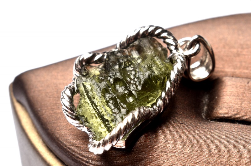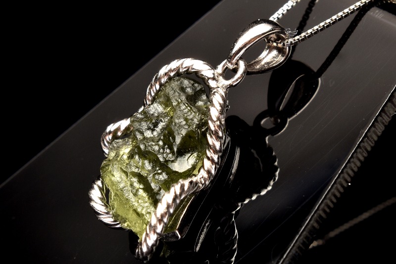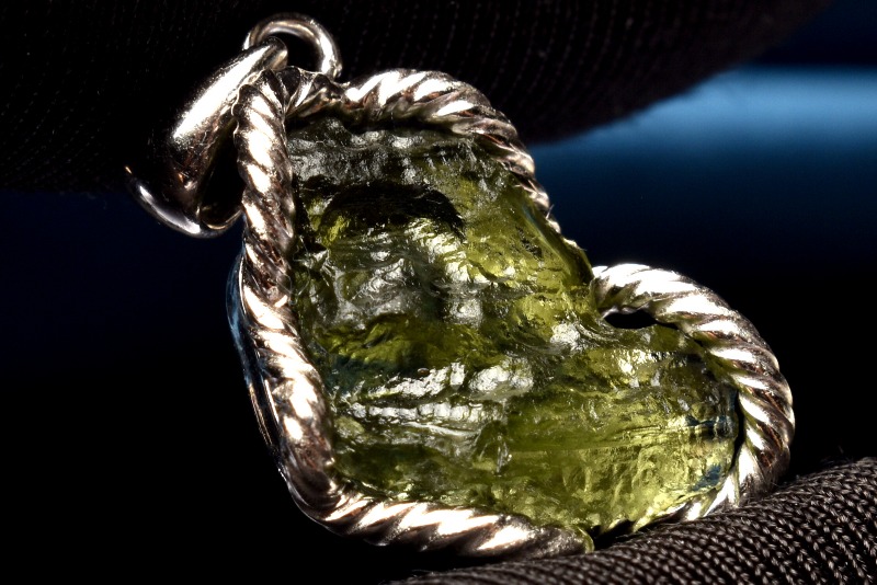 テクタイトは、遥か昔、地球に隕石が衝突した際に、その衝撃で地表の岩石が融解・飛散し、それらが冷やされてガラス質状に固まったものであるとされています。テクタイトは黒色ですが、モルダバイトは緑色、または褐色がかった透明で、ガラス光沢を放っています。