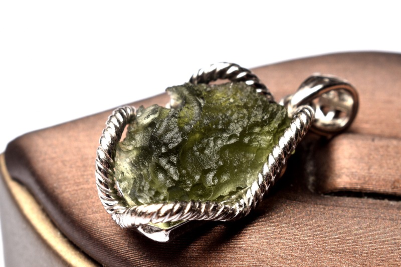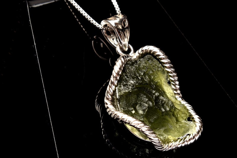 テクタイトは、遥か昔、地球に隕石が衝突した際に、その衝撃で地表の岩石が融解・飛散し、それらが冷やされてガラス質状に固まったものであるとされています。テクタイトは黒色ですが、モルダバイトは緑色、または褐色がかった透明で、ガラス光沢を放っています。