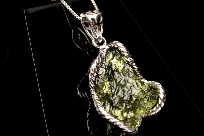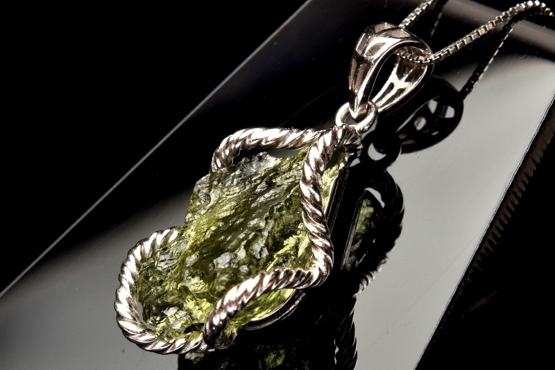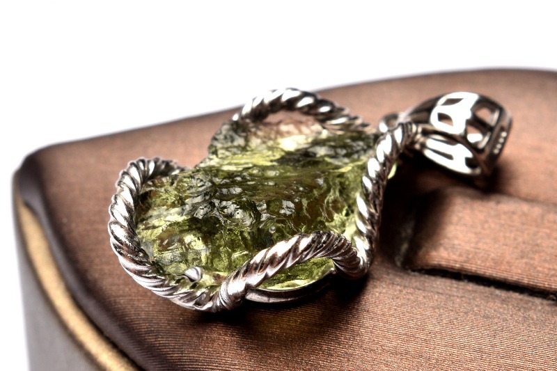 テクタイトは、遥か昔、地球に隕石が衝突した際に、その衝撃で地表の岩石が融解・飛散し、それらが冷やされてガラス質状に固まったものであるとされています。テクタイトは黒色ですが、モルダバイトは緑色、または褐色がかった透明で、ガラス光沢を放っています。