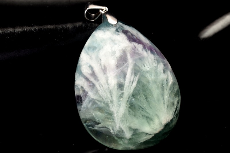 フェザーインフローライト(エンジェルフェザーフローライト・石花蛍石)は、フローライト(蛍石)の中に羽状の白い内包物が見られることからこう呼ばれています。