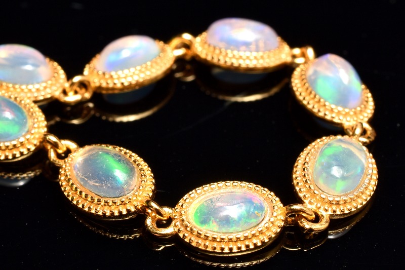 オパールの語源は、古代サンスクリット語の「宝石」を意味する「ウパラ」であるとされています。オパールは水中で微小な珪酸球が沈殿し、岩石の隙間などに密に蓄積して形成される石です。水晶等と同じく、珪素をメインにする鉱物ですが、その成り立ちから、水分が多く、硬度も非常に柔らかい石です。