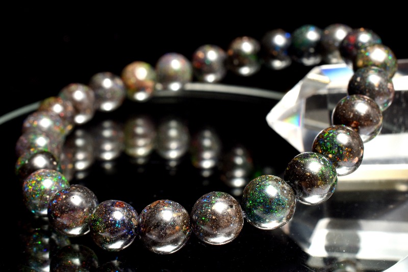 肉眼でも遊色は見られますが、強い光に当てると、まるで宇宙を見ているかのようにキラキラと煌めく美しいタイプ。