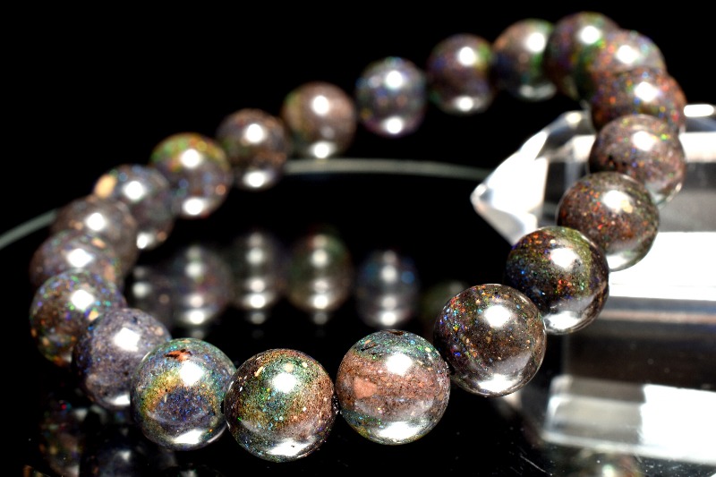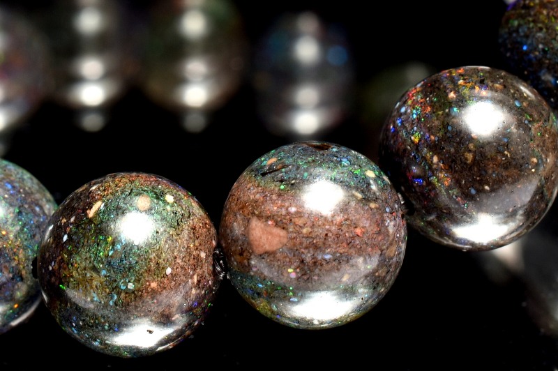 肉眼でも遊色は見られますが、強い光に当てると、まるで宇宙を見ているかのようにキラキラと煌めく美しいタイプ。