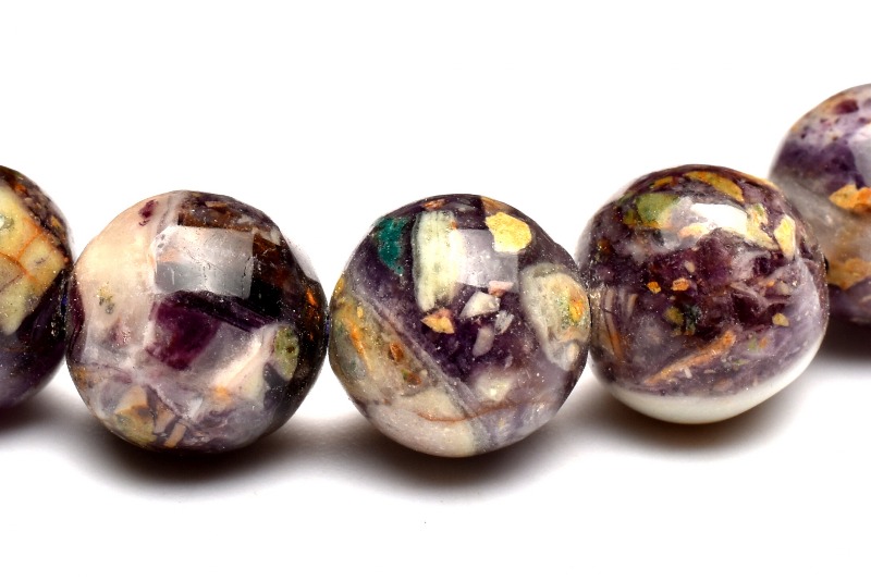 オパール・カルセドニーの基質の中に角礫状のフルオライトなどの複数の粒状の鉱物を含んで幻想的なマーブル模様を生み出しています。