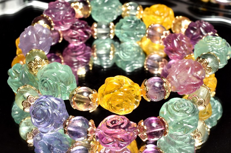 繊細彫刻◇マルチカラー フローライト 12-13x11-12(丸玉7)mm バラ彫刻 ブレスレット 1個売り _BG5676