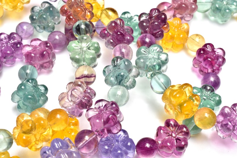 繊細彫刻◇マルチカラー フローライト 12-13x12(丸玉7.5)mm 梅の花彫刻 ブレスレット 1個売り _BG5677