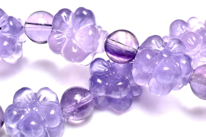 繊細彫刻◇ラベンダーパープル フローライト 12-13x12(丸玉7.5)mm 梅の花彫刻 ブレスレット 1個売り _BG5683