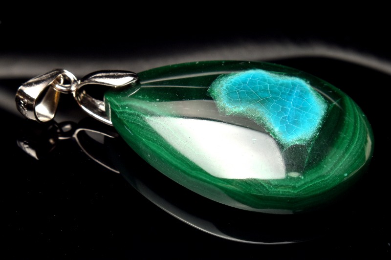 マラカイトの和名を「孔雀石」と言いますが、クリソコラの和名と似ている理由はマラカイトの組成に、珪素を加えたような組成となっているからです。