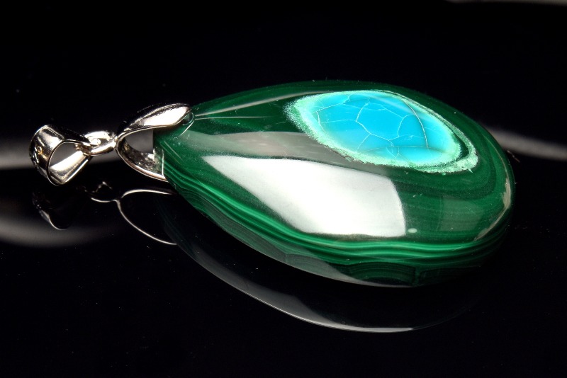 マラカイトの和名を「孔雀石」と言いますが、クリソコラの和名と似ている理由はマラカイトの組成に、珪素を加えたような組成となっているからです。
